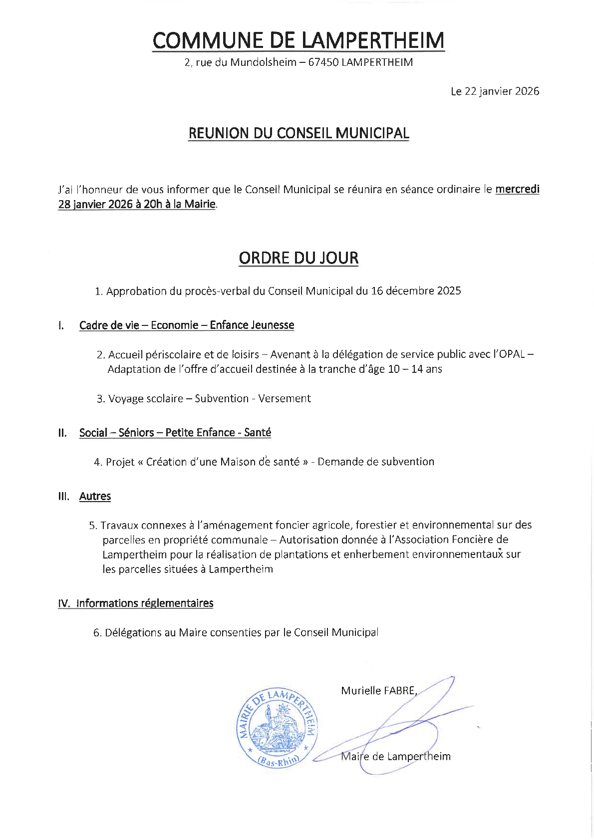 Le conseil municipal se réunira le mercredi 28 janvier à 20h00 à la mairie, salle du Conseil.