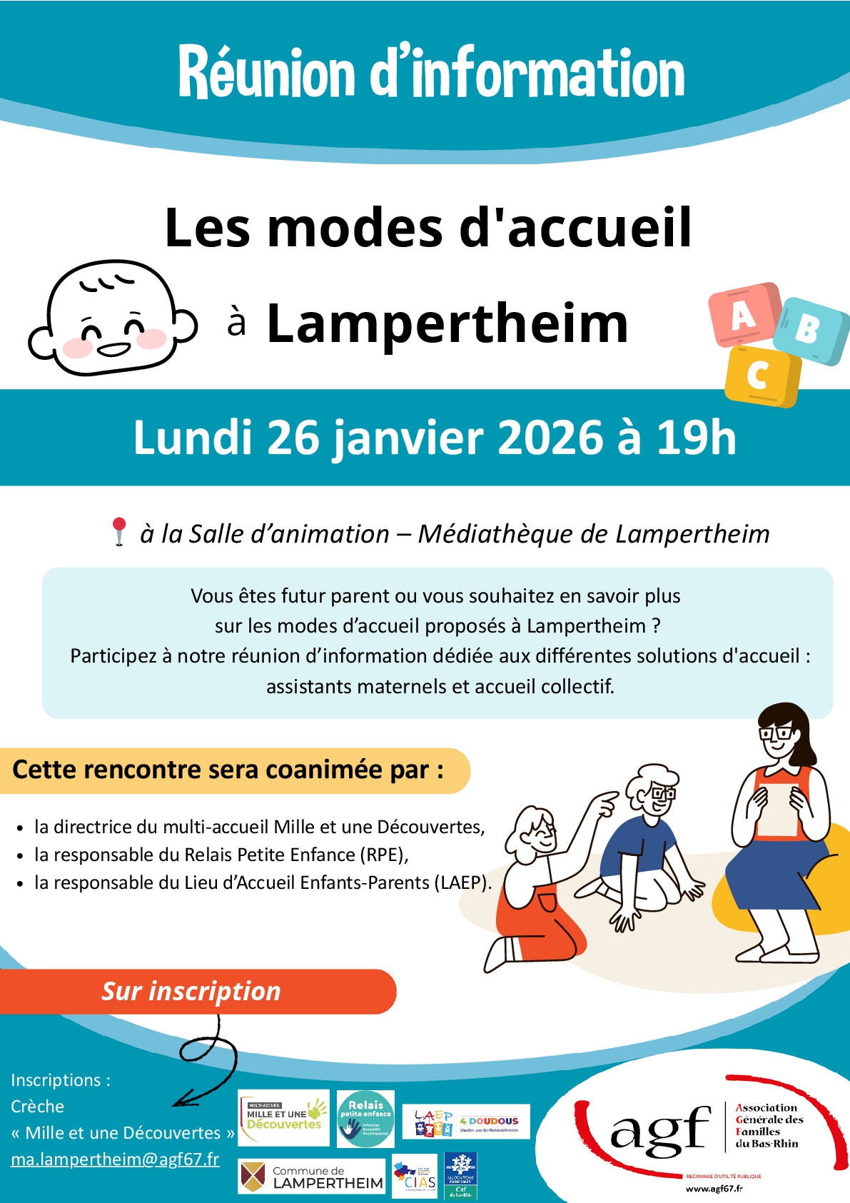 Rendez-vous le lundi 26 janvier 2026 à 19h00 à la salle d’animation de la médiathèque de Lampertheim pour une réunion d’information en présence des responsables de crèche, relais petite enfance et Lieu d’Accueil Enfants Parents.