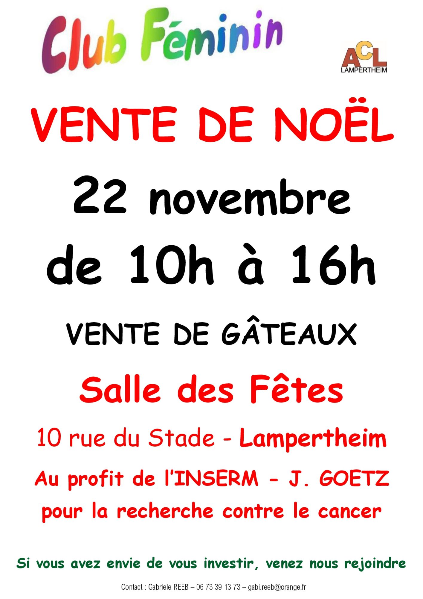 La traditionelle vente de Noël du Club Féminin aura lieu le 22 novembre de 10h à 16h à la salle des Fêtes.